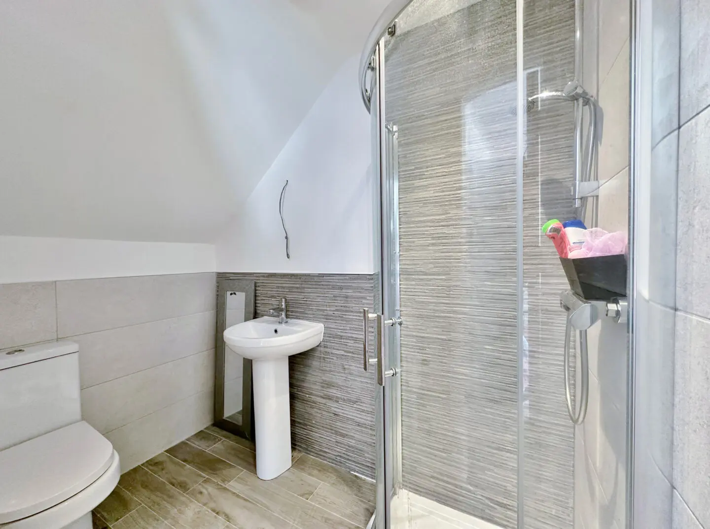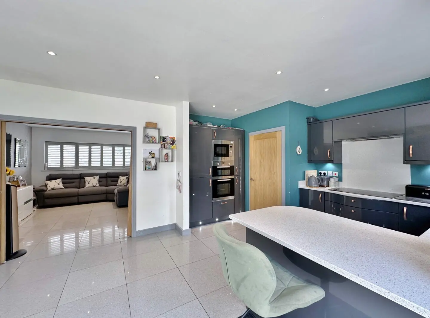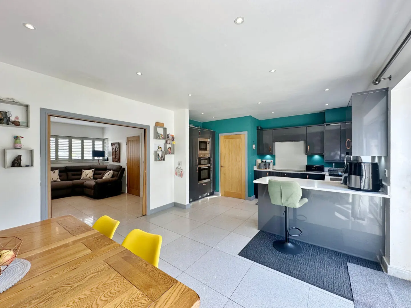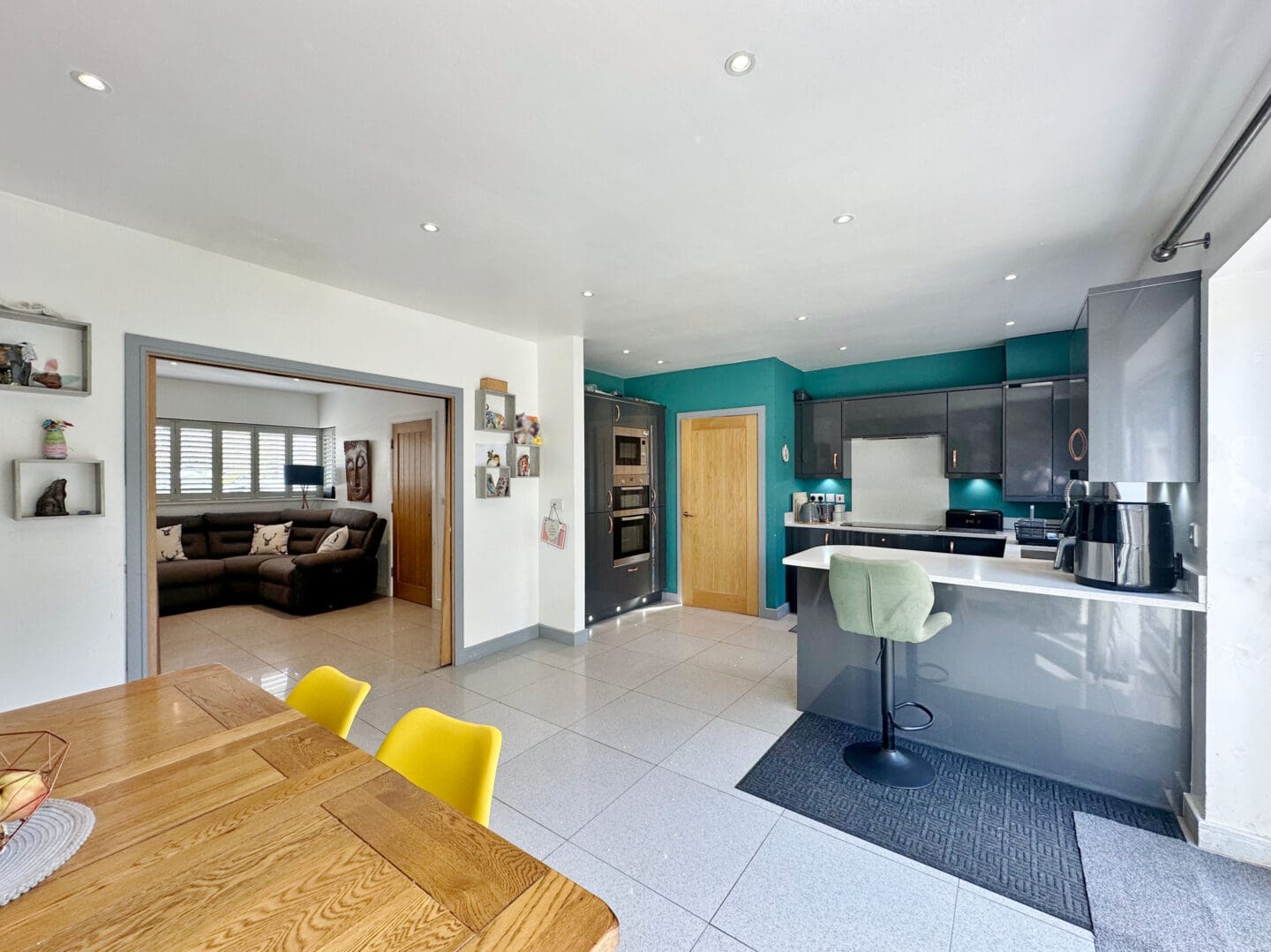 The interior has been finished with a fresh, contemporary décor throughout. The ground floor welcomes you with a hallway offering useful storage and a convenient downstairs W.C. A bright, well proportioned living room opens via sliding double doors into a stylish open plan kitchen and dining area with patio doors opening to the delightful rear garden. A practical walk in pantry/utility space is neatly tucked just off the kitchen, adding to the home’s functionality.