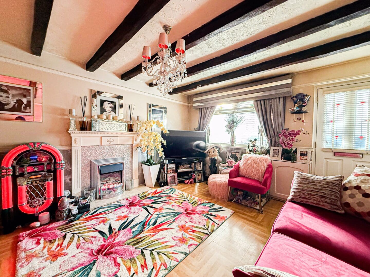 A welcoming family lounge greets you into the property, featuring charming exposed beams and an eye-catching fireplace, followed by a fitted kitchen and a conservatory.