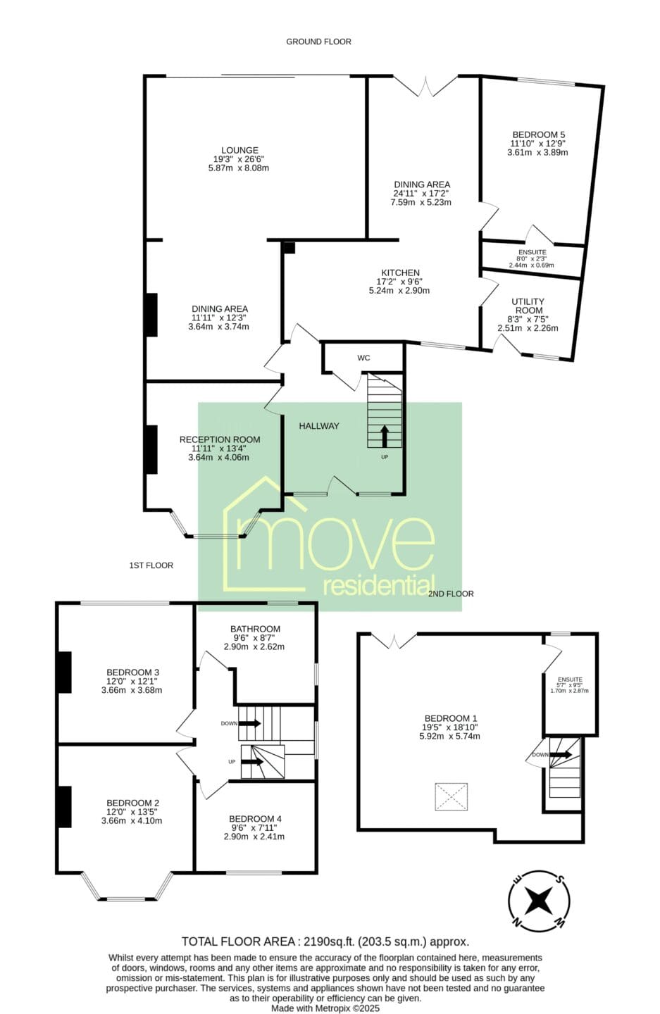 The welcoming entrance hall leads to a convenient downstairs W.C., a bay fronted lounge with a feature fireplace, and a bright, open plan lounge/dining room stretching over 26ft, complete with patio doors opening onto the delightful rear garden. At the heart of the home lies a stunning kitchen/diner, superbly fitted with a comprehensive range of wall and base units, contrasting worktops, integrated appliances, and a practical utility room. The ground floor also benefits from a fifth bedroom with its own en suite shower room. The first floor offers two generous double bedrooms, a single bedroom, and a contemporary four piece family bathroom. The top floor hosts a superb principal bedroom with a Juliet balcony overlooking the garden and a private luxury en suite.