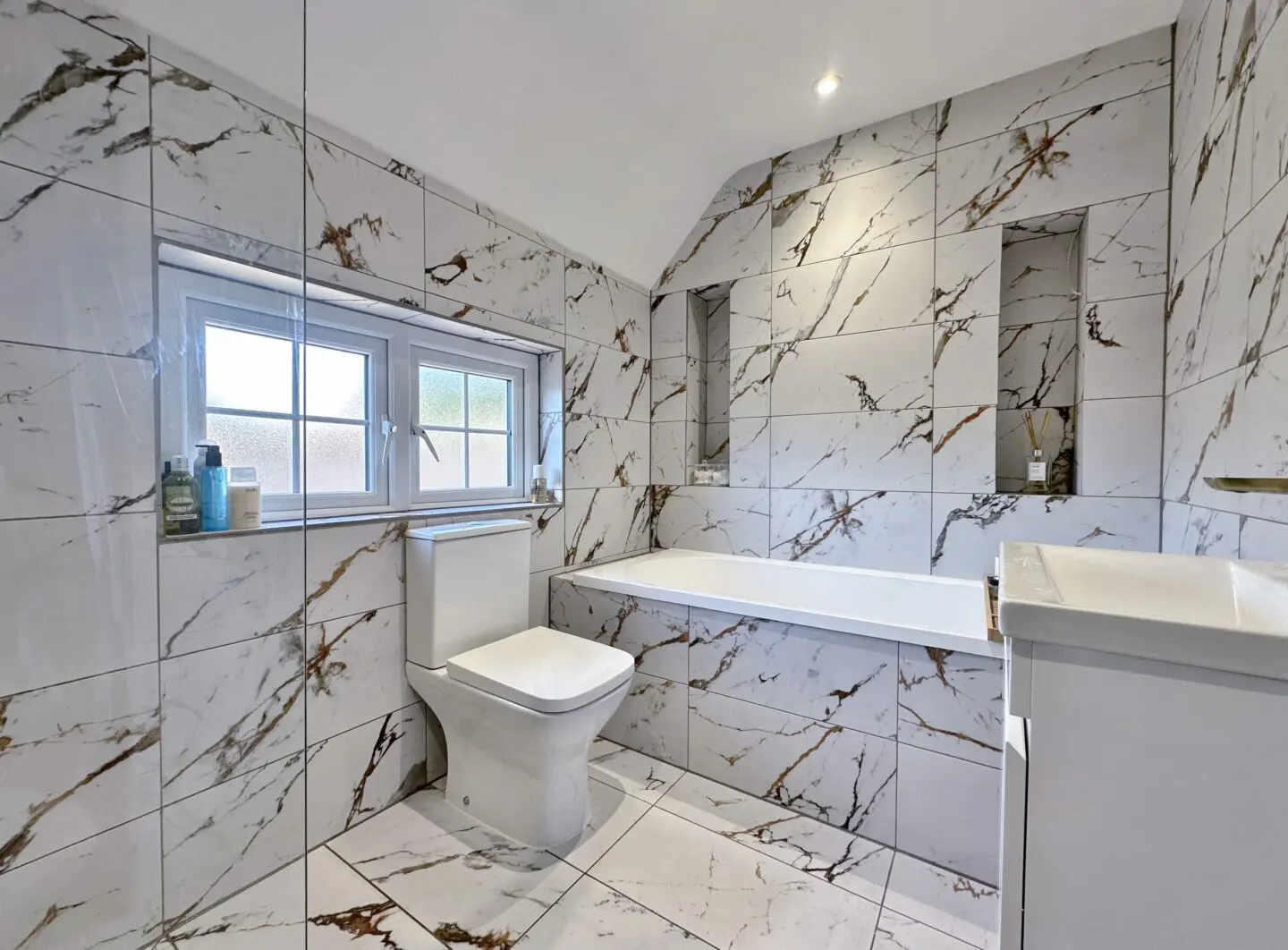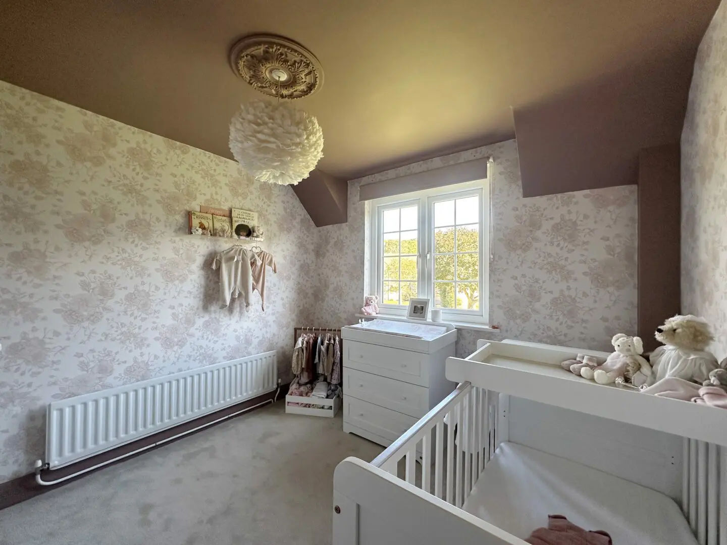 On the ground floor, a welcoming hallway leads to a spacious lounge with a feature fireplace and patio doors opening onto the front garden, creating an inviting space for family life or entertaining. A separate dining room and a modern, well fitted kitchen diner with a comprehensive range of wall and base units provide versatile areas to suit every lifestyle. Upstairs, the accommodation comprises two generous double bedrooms, one with fitted wardrobes, alongside a third bedroom and a luxurious new four piece family bathroom, finished to the highest standard. Practicality is also a key feature of this home, with ample off road parking and a large detached double garage completing the offering.