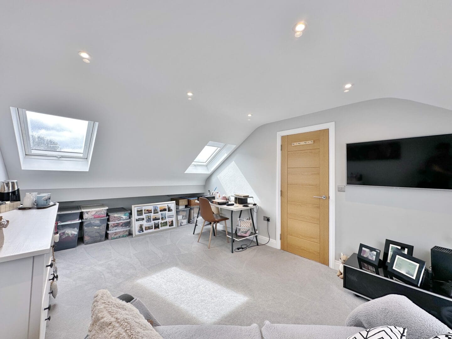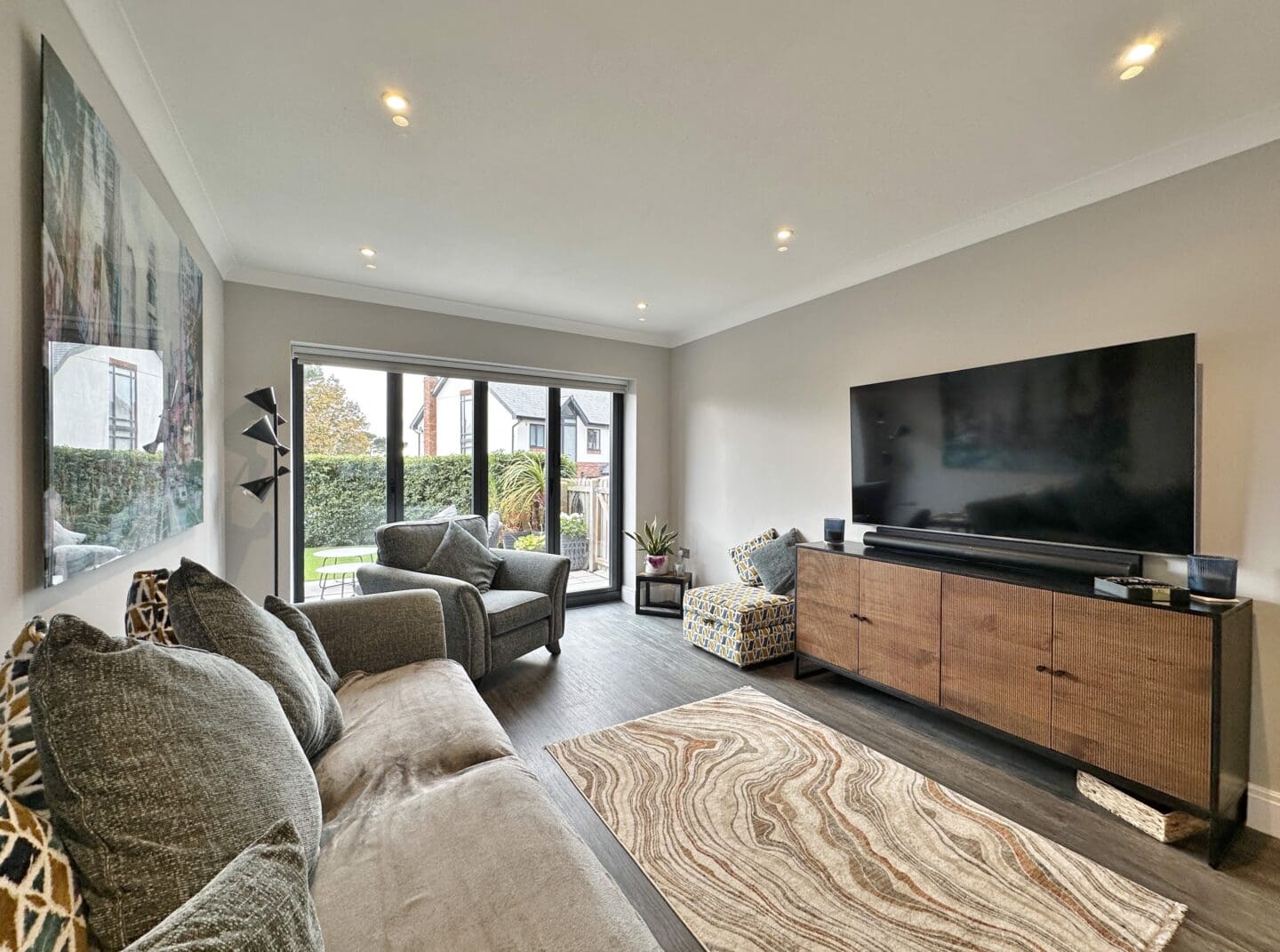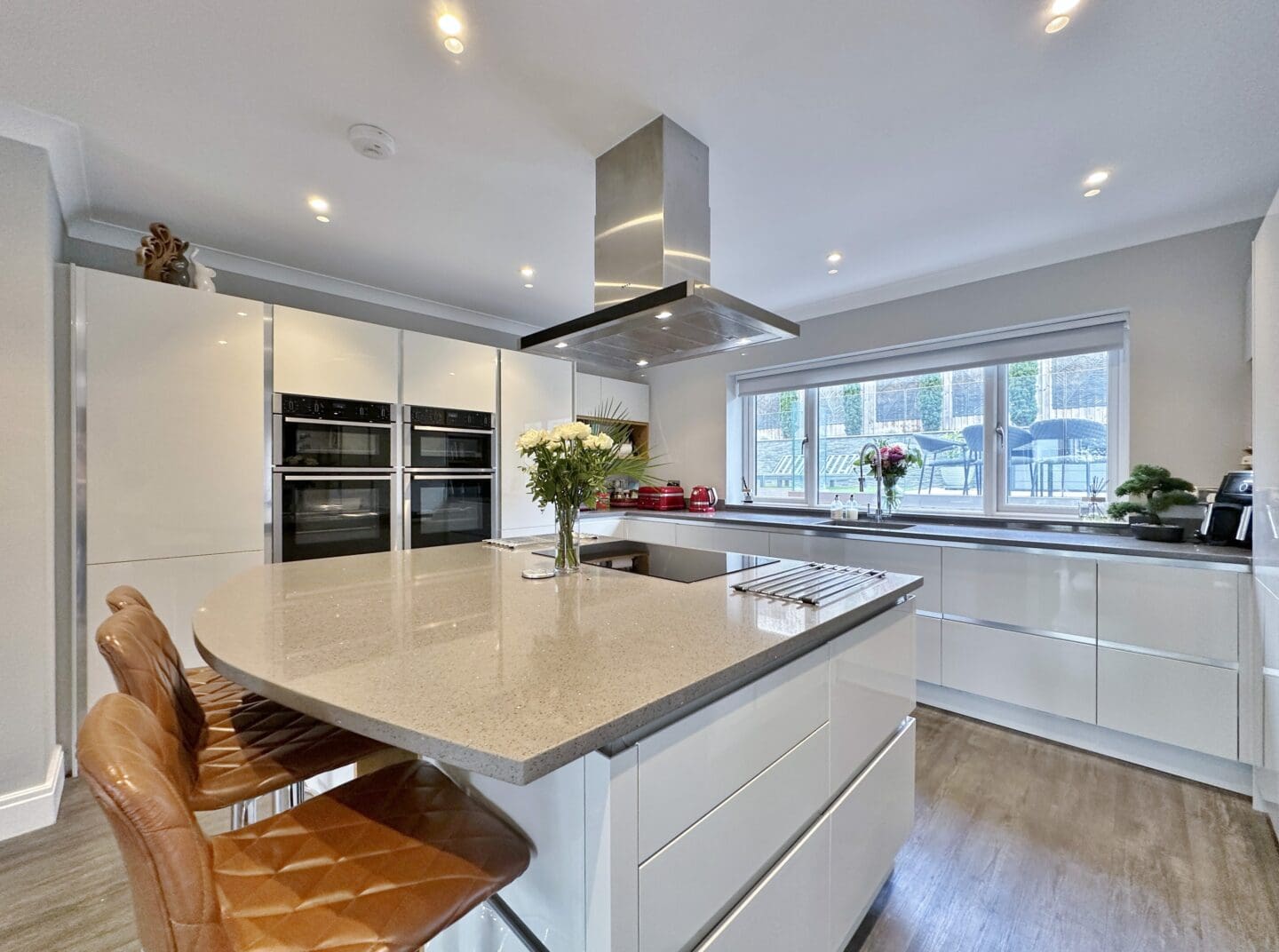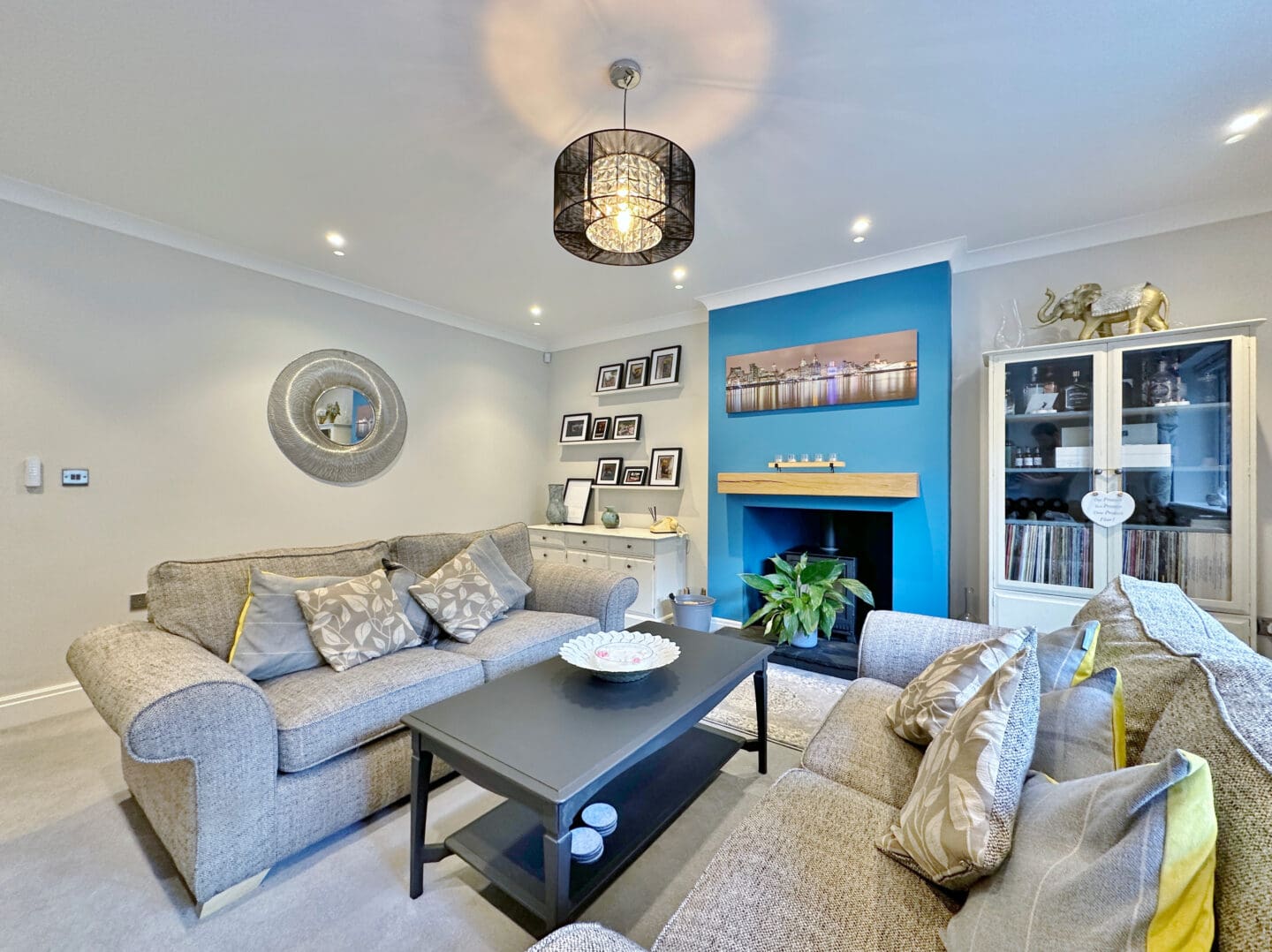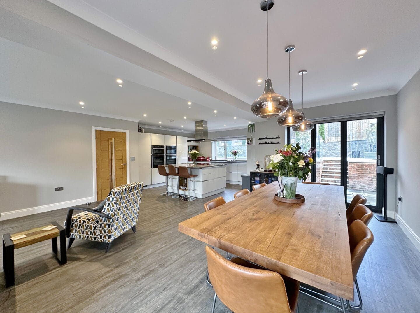 Inside, the accommodation is spread over three floors. The ground level is centred around a striking open plan living, dining, and kitchen area, complete with a large island and high end appliances. Bi-folding doors open out onto the rear garden, which has been designed for entertaining and relaxation, featuring porcelain paving, mature planting, a pergola, and hot tub. A separate lounge with a log-burning stove, a home office, a utility room, and a shower room complete this floor. The first floor offers a superb master suite with Juliet balcony, a walk through dressing area (which could be converted back into a bedroom), and an adjoining en-suite. Two further bedrooms share a modern shower room. On the top floor are two additional doubles with fitted storage and wonderful views extending towards Wales, along with another stylish shower room.