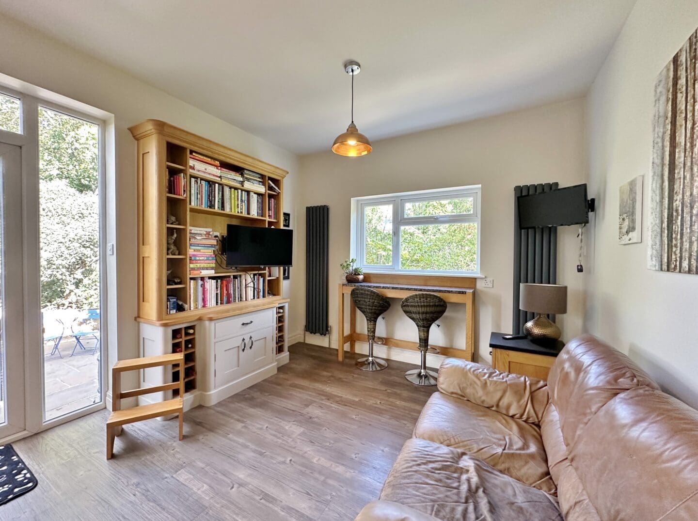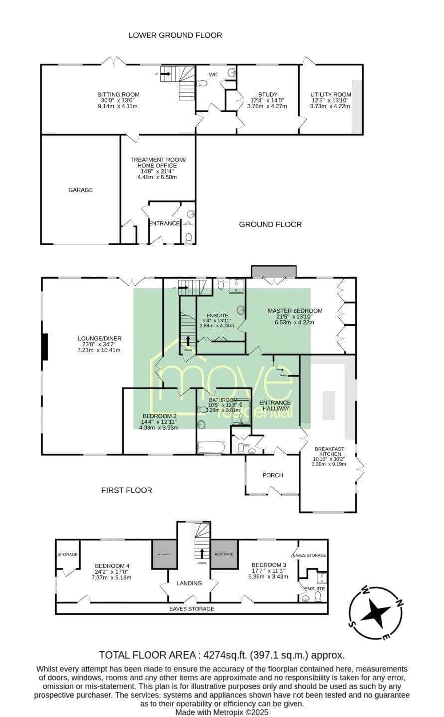 The lower ground floor benefits from its own entrance, making it ideal for a variety of uses. This level includes a versatile home office/treatment room with W.C, a large sitting room with feature log burner and patio doors to the rear garden, a utility room, study/fifth bedroom and an additional W.C. Upstairs, the first floor hosts two further double bedrooms one with en suite shower room.