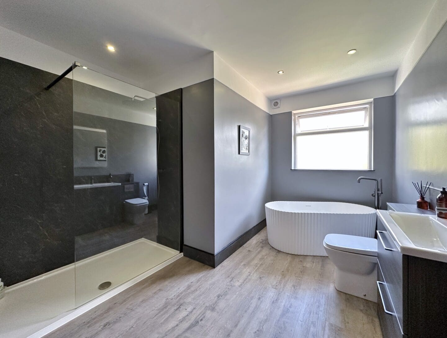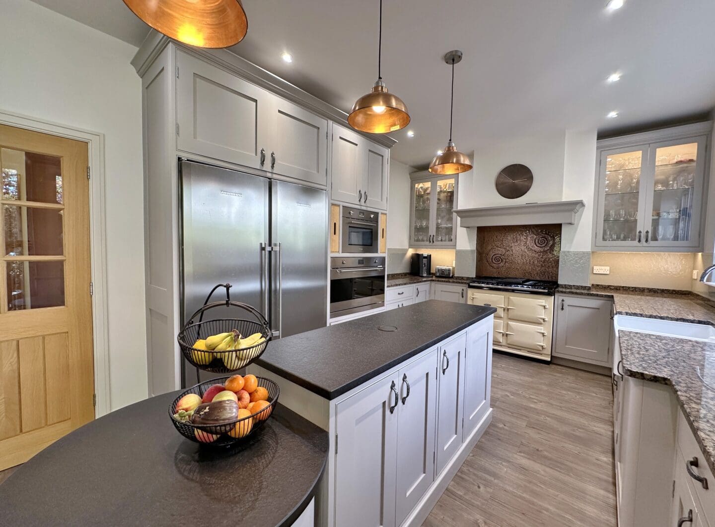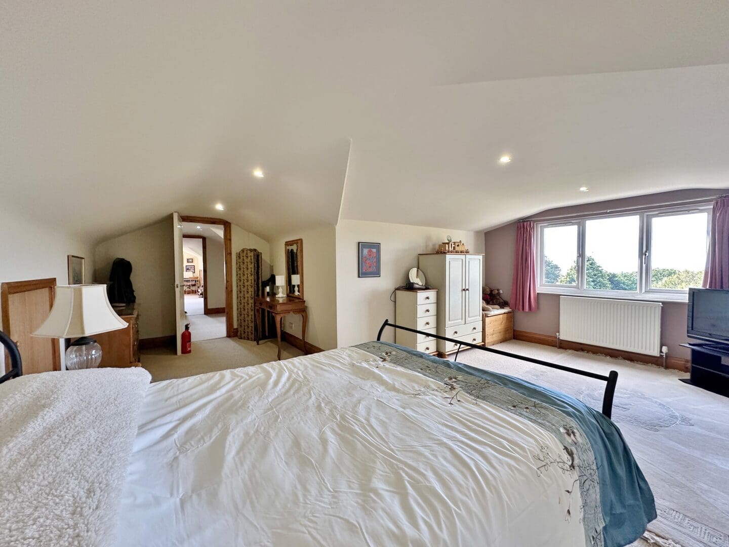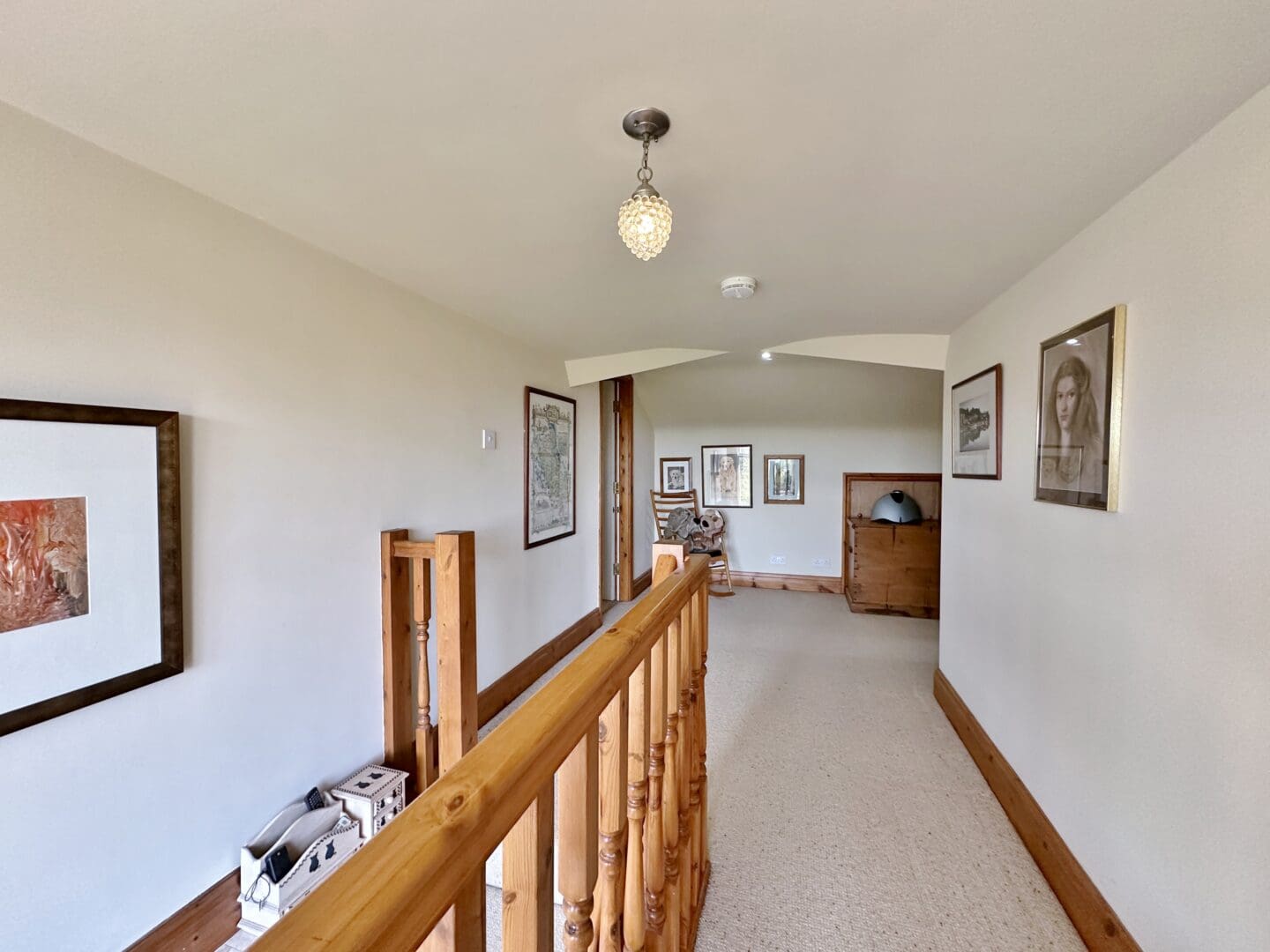 The accommodation begins with a welcoming hallway leading through double doors to a generous lounge, complete with log burner and Juliette balcony overlooking delightful views. At the heart of the home is a stunning open plan kitchen, family, and breakfast area, boasting a bespoke handmade kitchen from Mckyes with integrated appliances. The ground floor also features a luxurious master suite with dressing room, en suite, and Juliette balcony, along with a second double bedroom, a four piece bathroom and separate W.C.