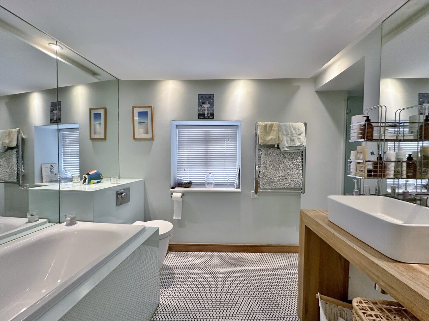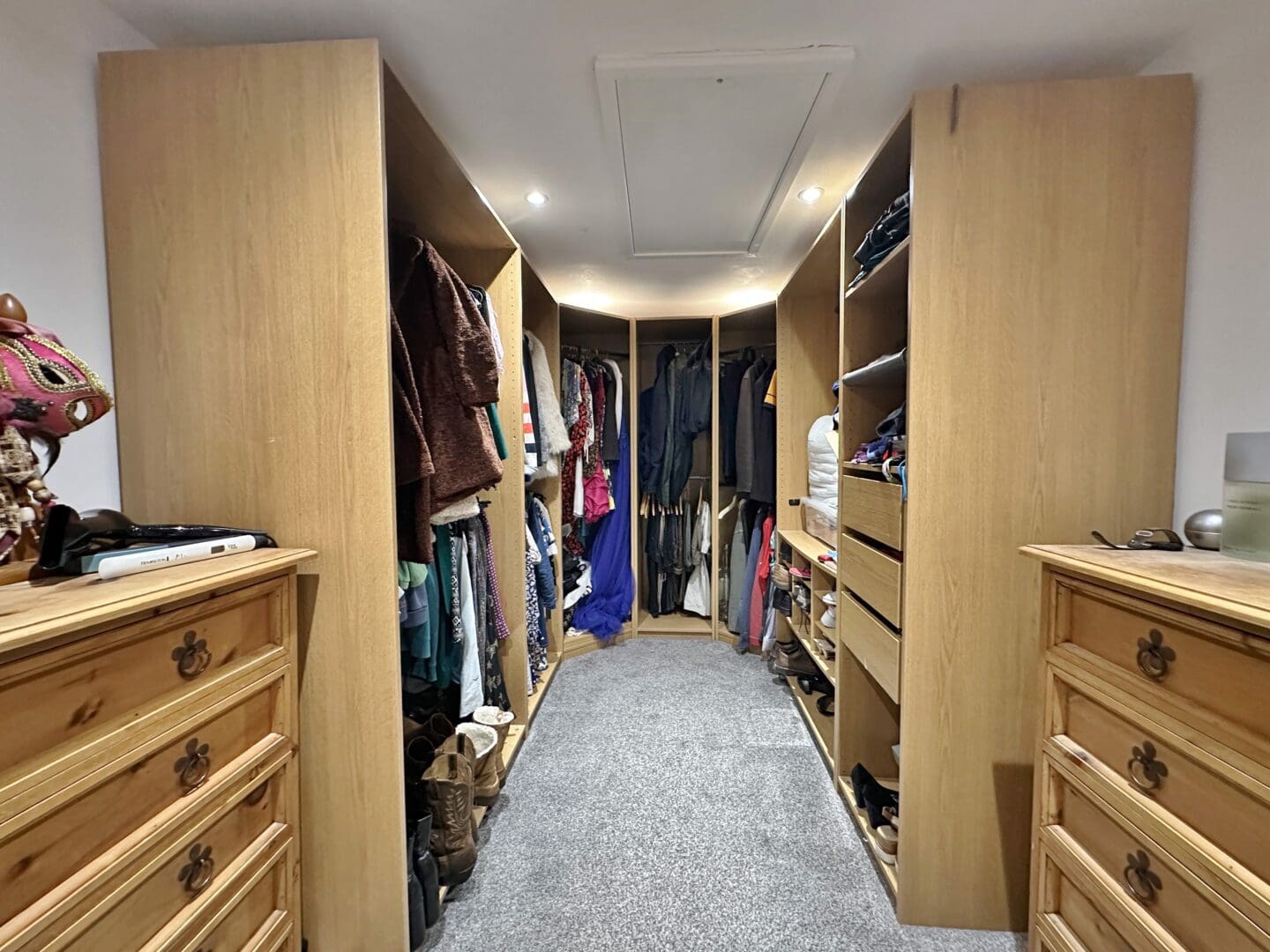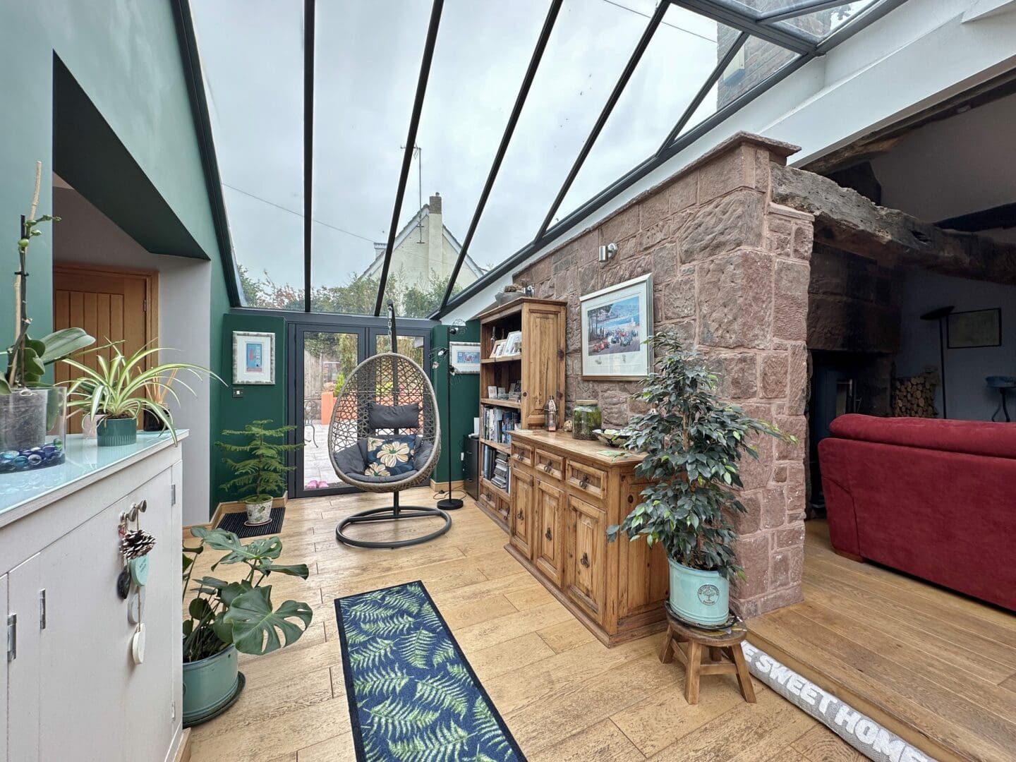 The original building has been thoughtfully preserved, with key historic features such as the cruck frame and exposed beams left intact. Slate roof tiles and windows have been replaced with sensitive, high quality alternatives, while solid oak doors and flooring complement the exposed sandstone walls. Underfloor heating ensures modern comfort without compromising the character of the interiors. Every detail, from the built in sound system to the choice of finishes, reflects a commitment to superior quality and careful consideration.