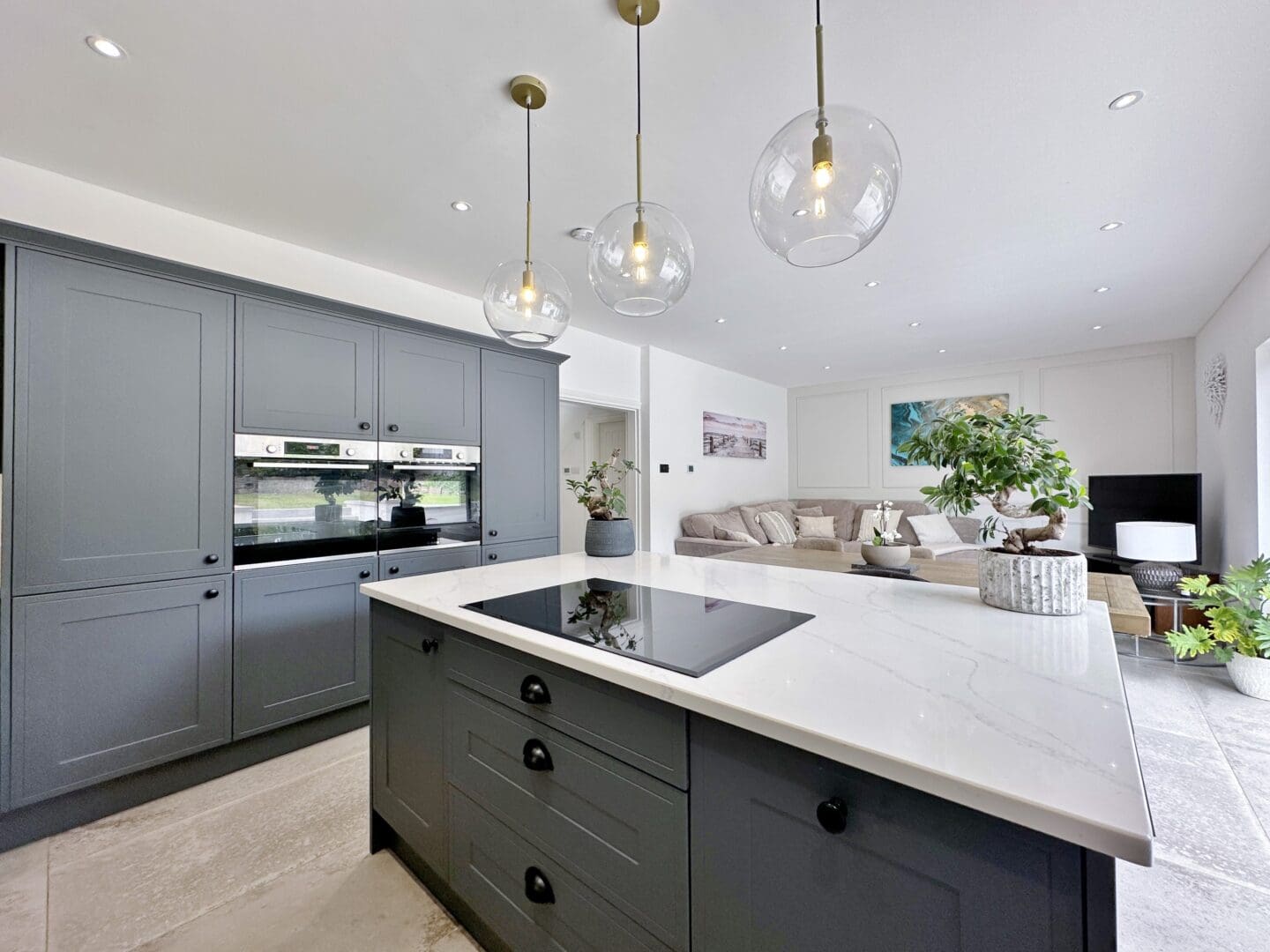 Upon entering, you're welcomed into a bright and airy hallway, complete with a galleried landing that floods the space with natural light. To the front of the property, a spacious lounge with a feature fireplace offers a cosy retreat. At the heart of the home lies a breathtaking open plan living kitchen diner, featuring a bespoke fitted kitchen with a comprehensive range of wall and base units, integrated appliances, and a large central island. The space seamlessly flows into a dining and lounge area, with bi-folding doors that open out to the landscaped rear garden, effortlessly blending indoor and outdoor living. The ground floor also benefits from a practical utility room, two generous double bedrooms, one with a sleek en suite shower room and a luxurious main shower room.