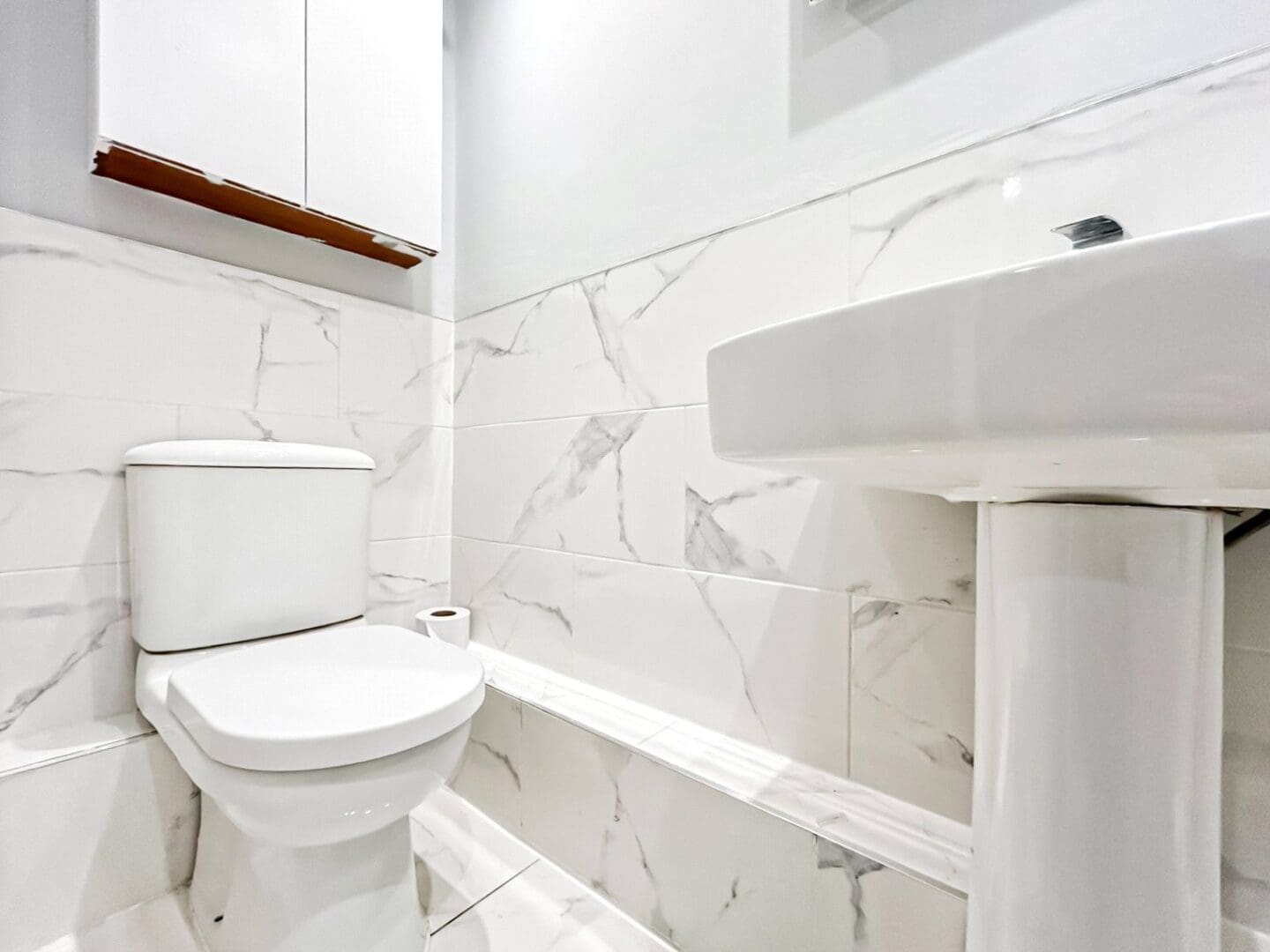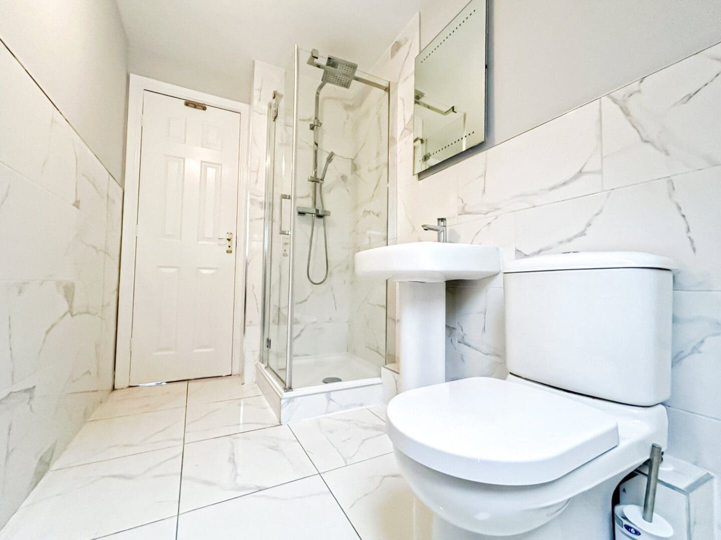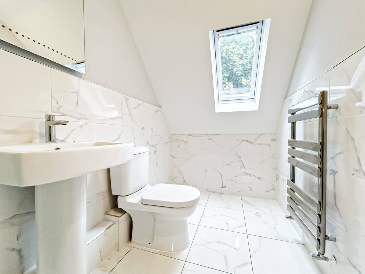 Upstairs, the first floor hosts two generously sized double bedrooms and a modern family bathroom with elegant marble-effect tiling. The top floor is home to a luxurious master suite with its own en-suite shower room, alongside a versatile fourth bedroom that could also serve as a home office.