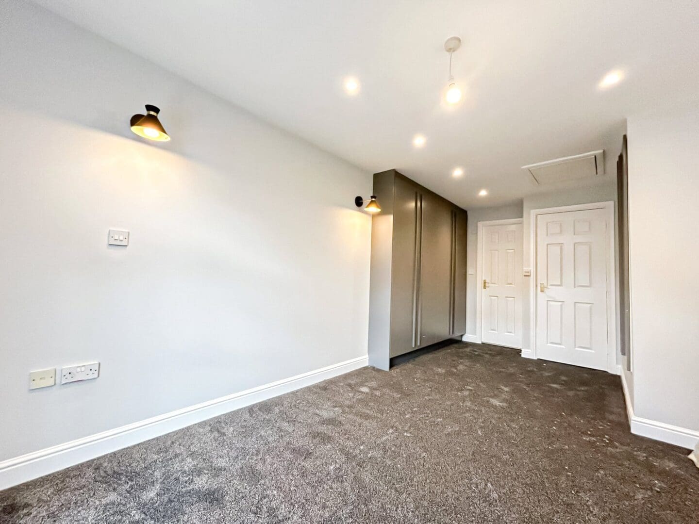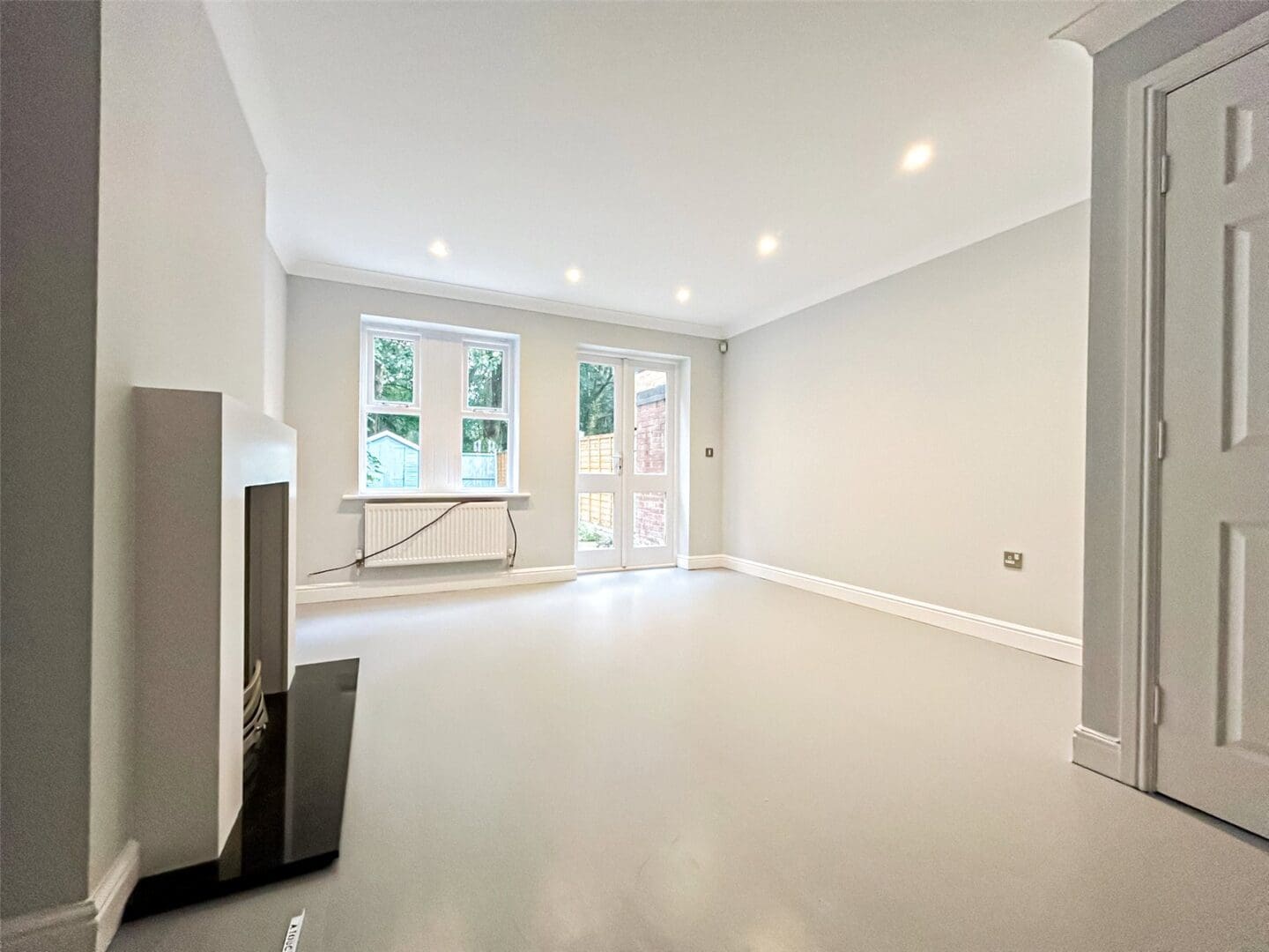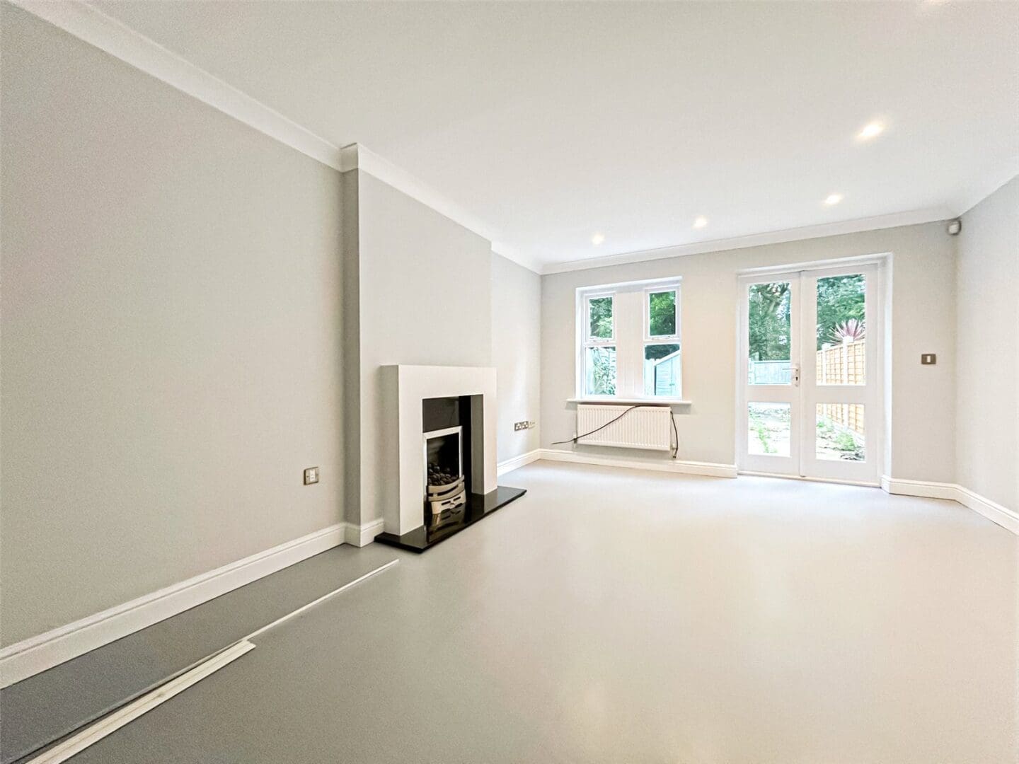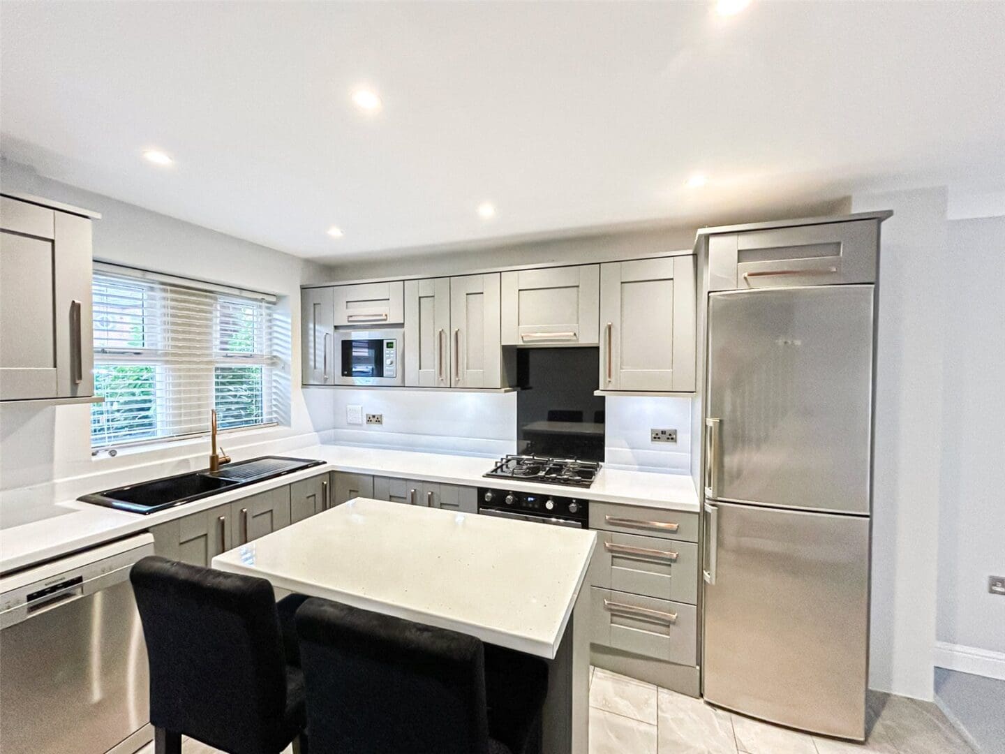 Step inside to discover a beautifully designed open-plan kitchen, dining, and living area—ideal for entertaining or relaxed family living. The kitchen features sleek fitted units, complementary worktops, and a breakfast bar, while the lounge area boasts wood-style flooring, a feature fireplace, and French doors leading to a private rear garden.